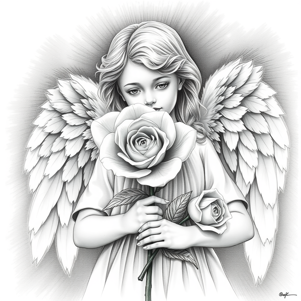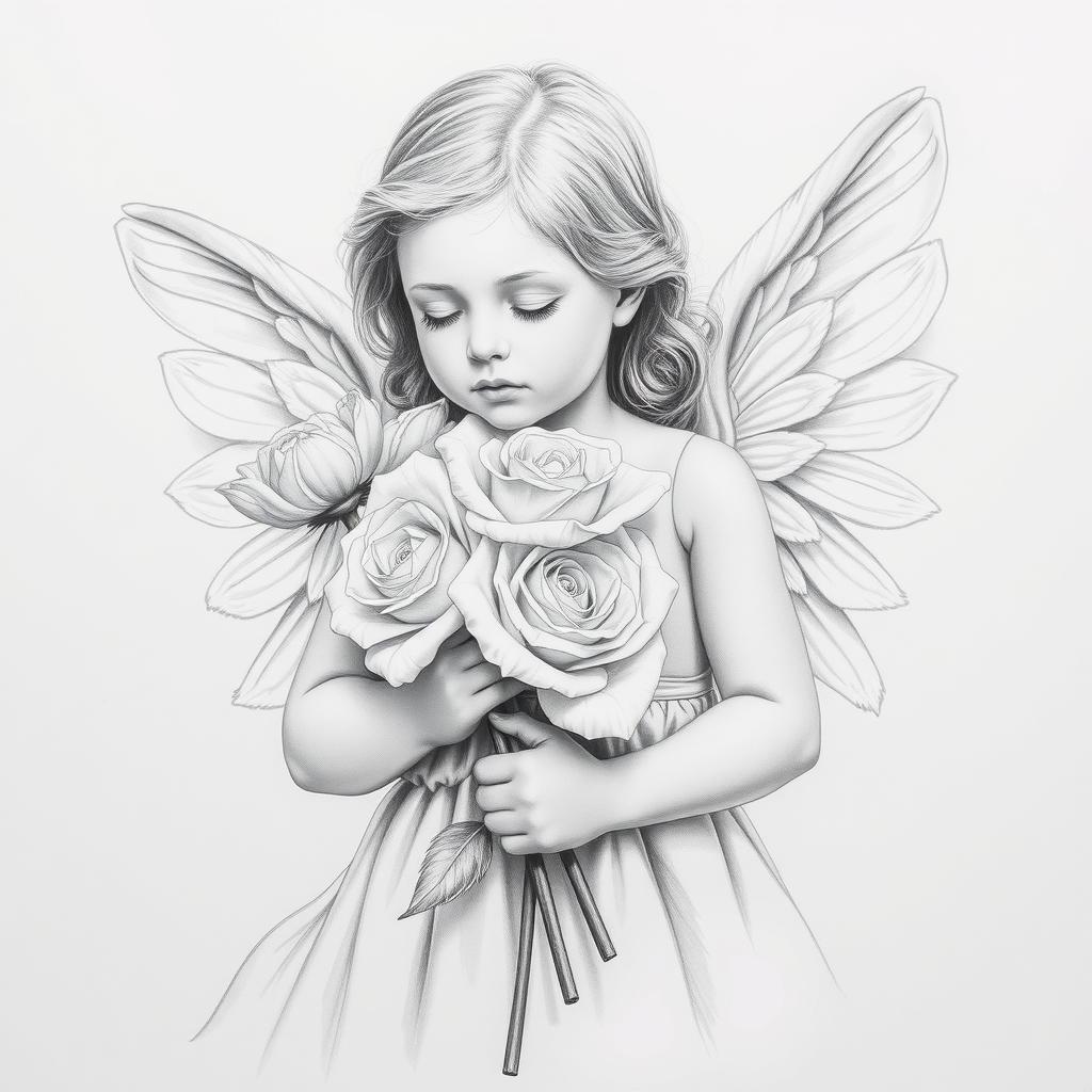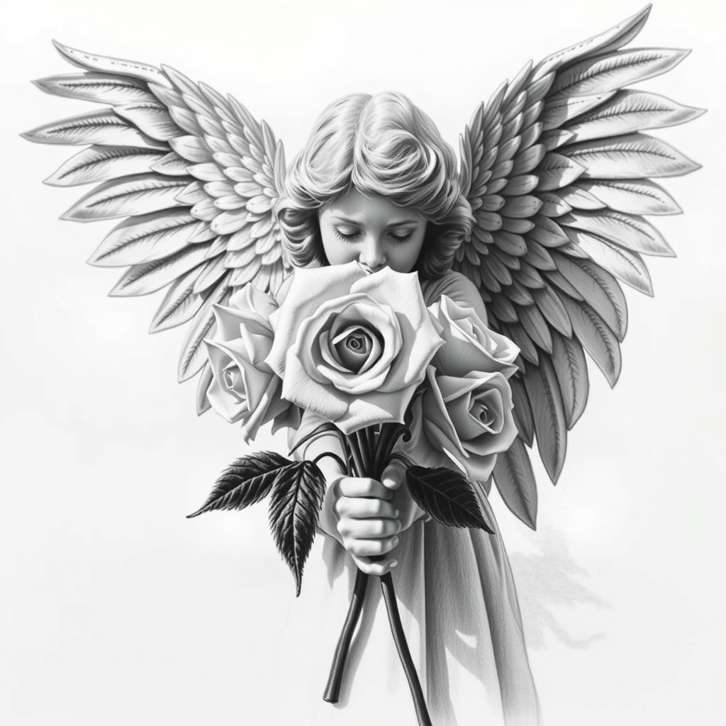 Angel holding flower super Deerfield roses drawing β highly detailed graphite drawing, fine shading, soft texture, realistic pencil sketch style β highly detailed graphite drawing, fine shading, soft texture, realistic pencil sketch style