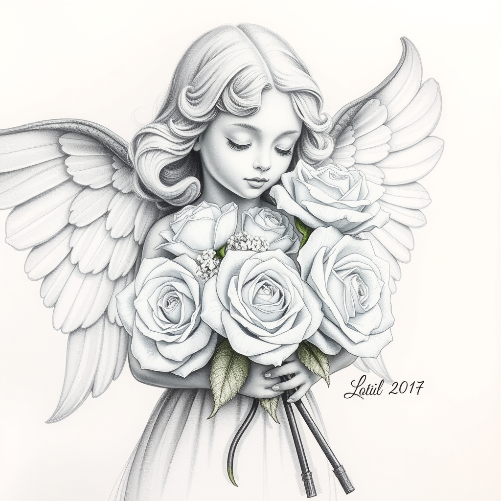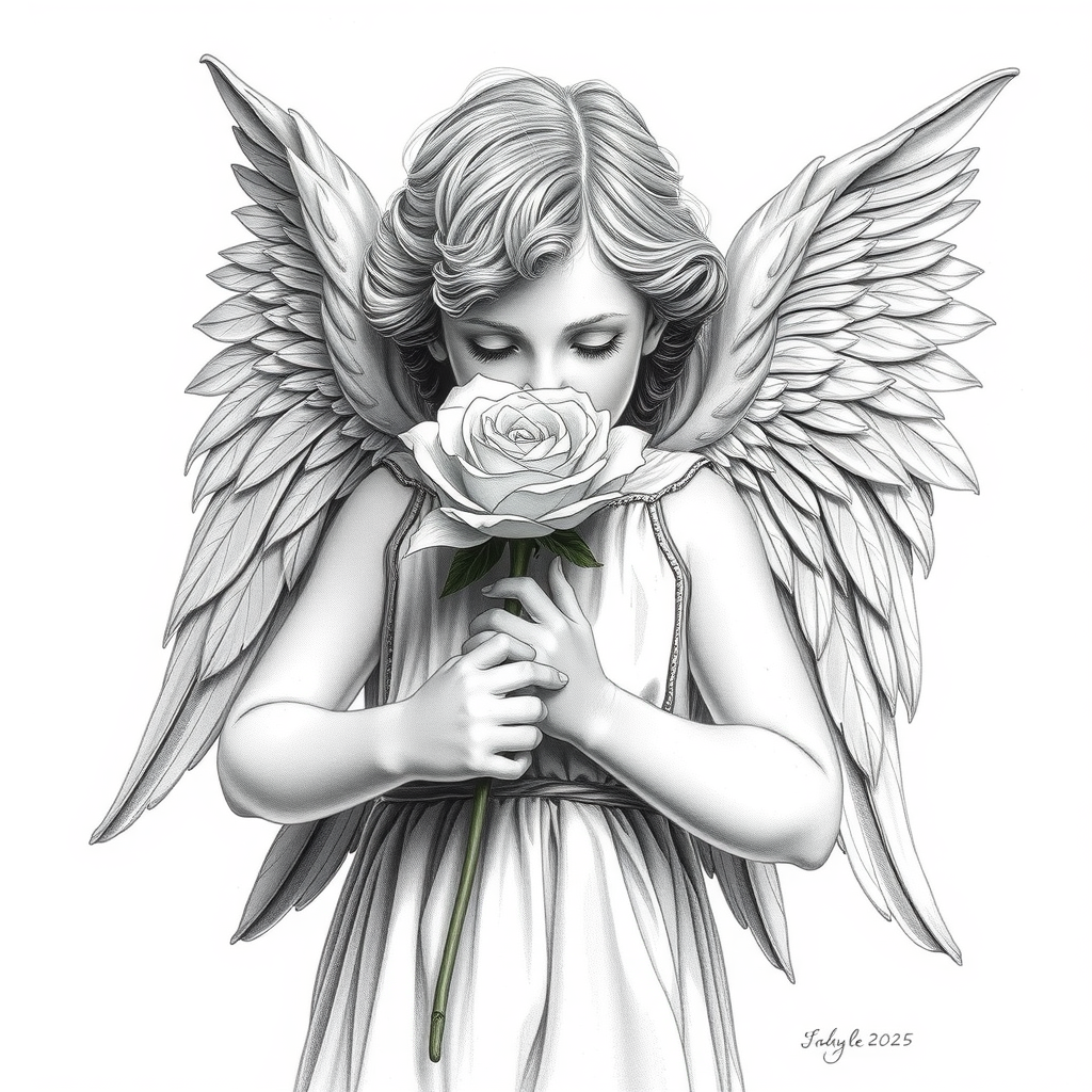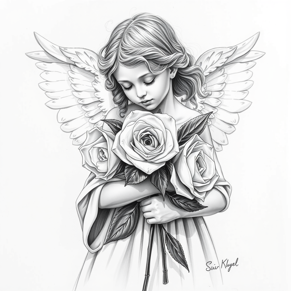 Angel holding flower super Deerfield roses drawing β highly detailed graphite drawing, fine shading, soft texture, realistic pencil sketch style β highly detailed graphite drawing, fine shading, soft texture, realistic pencil sketch style