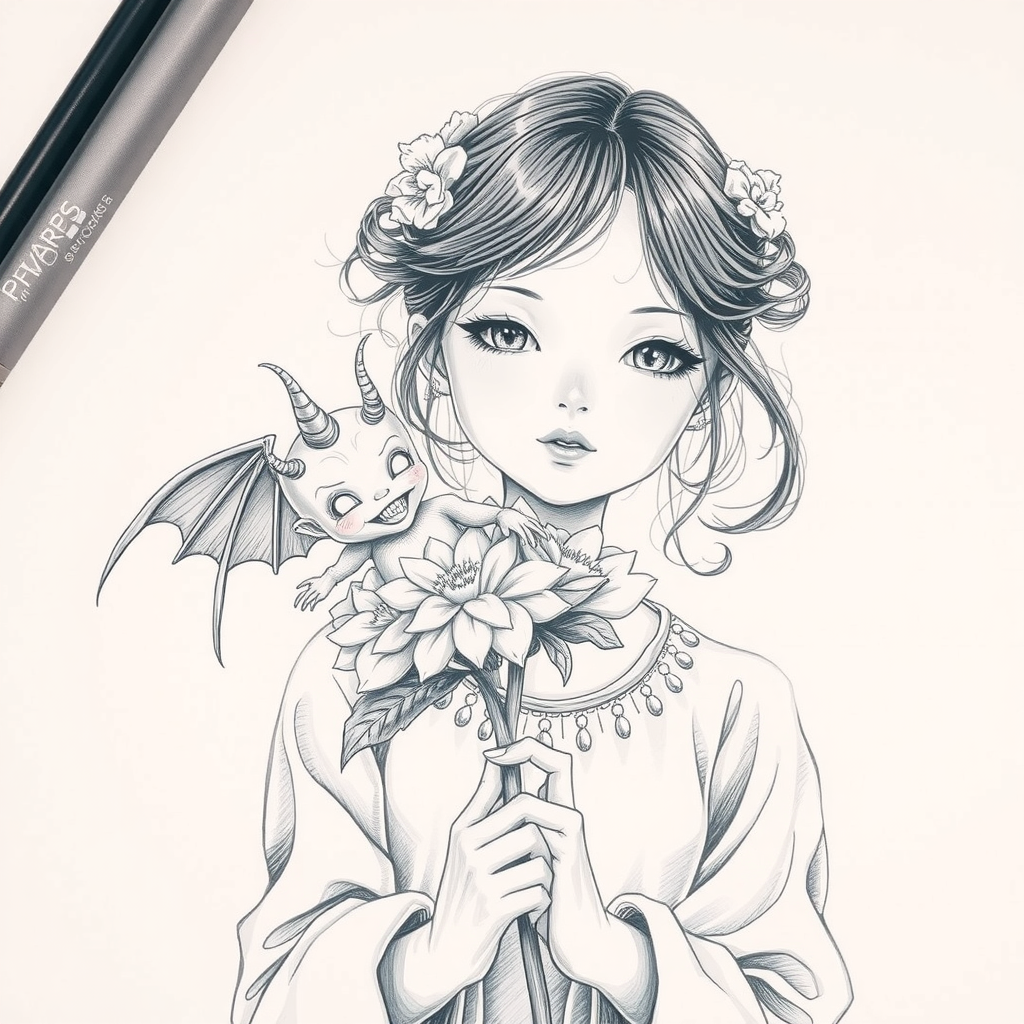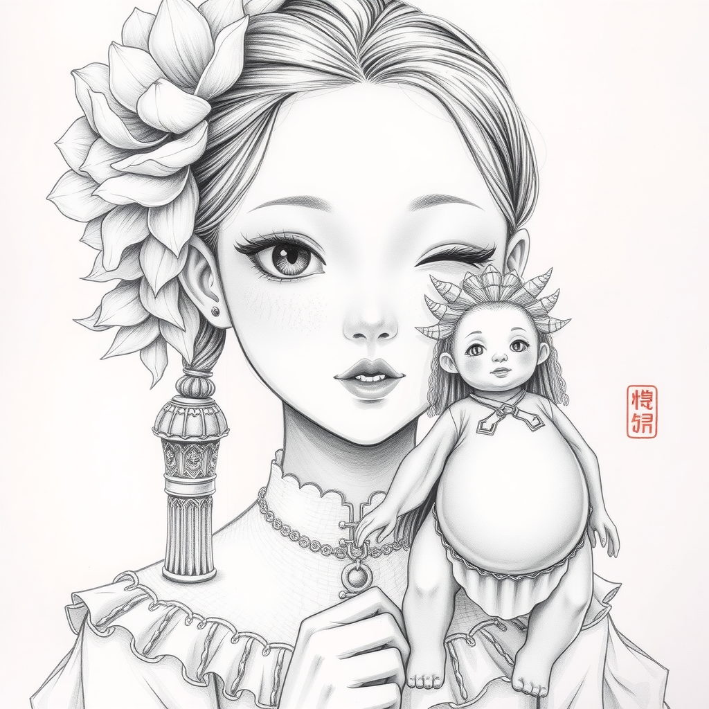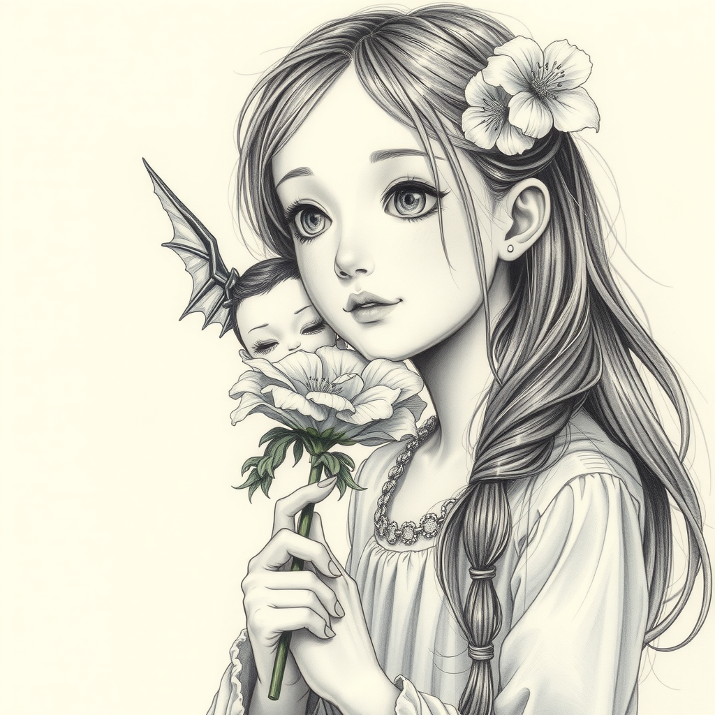 A girl holding a flower with a demon holding a Chinese doll out of her her face super detailed drawing β highly detailed graphite drawing, fine shading, soft texture, realistic pencil sketch style
