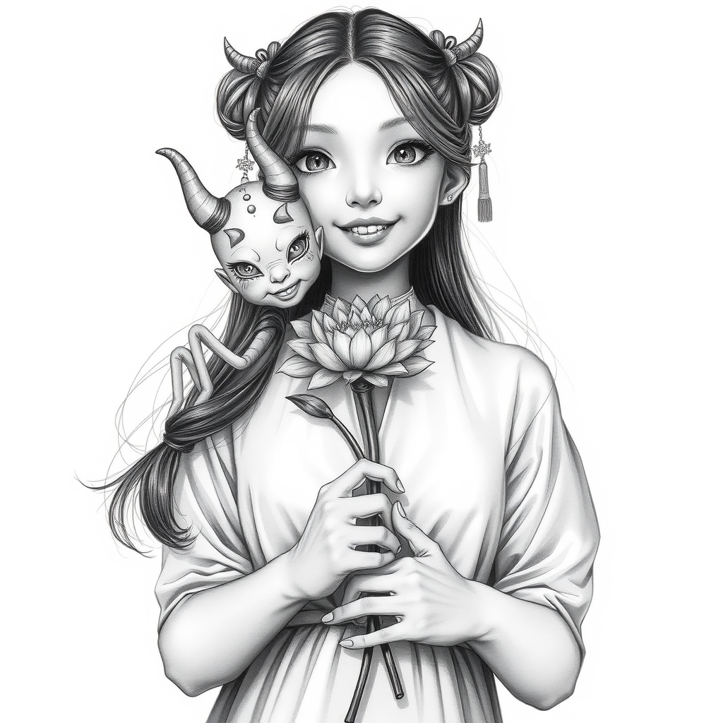 A girl holding a flower with a demon holding a Chinese doll out of her her face super detailed drawing β highly detailed graphite drawing, fine shading, β highly detailed graphite drawing, fine shading, soft texture, realistic pencil sketch style