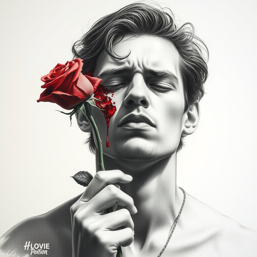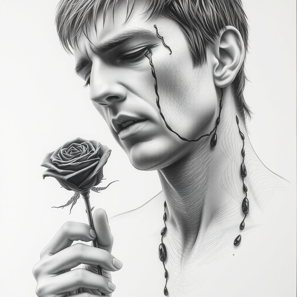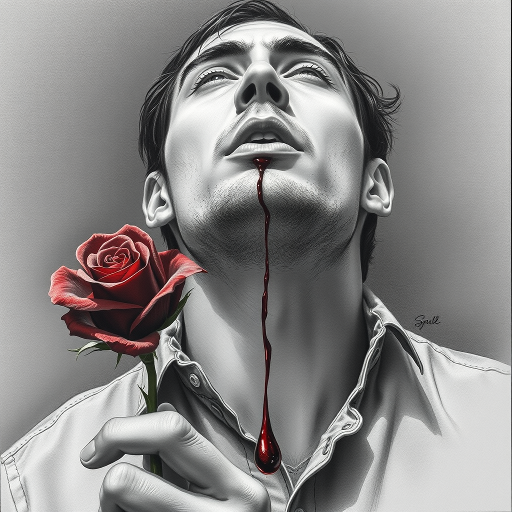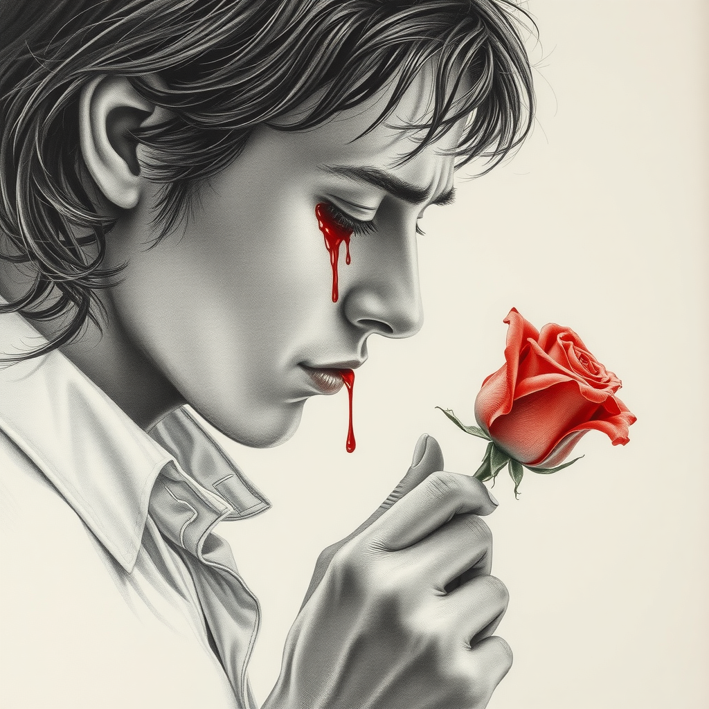 : Drawn of a man you suffering from like mad depression, holding a rose in his hand while heβs like flying out of his fucking face and then thereβs like blood dripping down like part of his neck super detailed like Japanese fine detail pointillism 0.53 mm beyond realistic, hyper realism, fucking high tech artist extraordinary β highly detailed graphite drawing, fine shading, soft texture, realistic pencil sketch style front view, not too bloody, but like super realistic, with him, like looking at the rose and all unlike distress of β highly detailed graphite drawing, fine shading, soft texture, realistic pencil sketch style