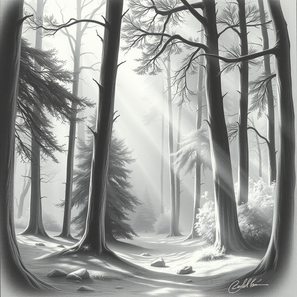 a serene forest glade with morning mist, high contrast, dramatic rim lighting, soft bokeh, natural skin tones. cinematic composition. High resolution, cinematic, subtle film grain. β highly detailed graphite drawing, fine shading, soft texture, realistic pencil sketch style