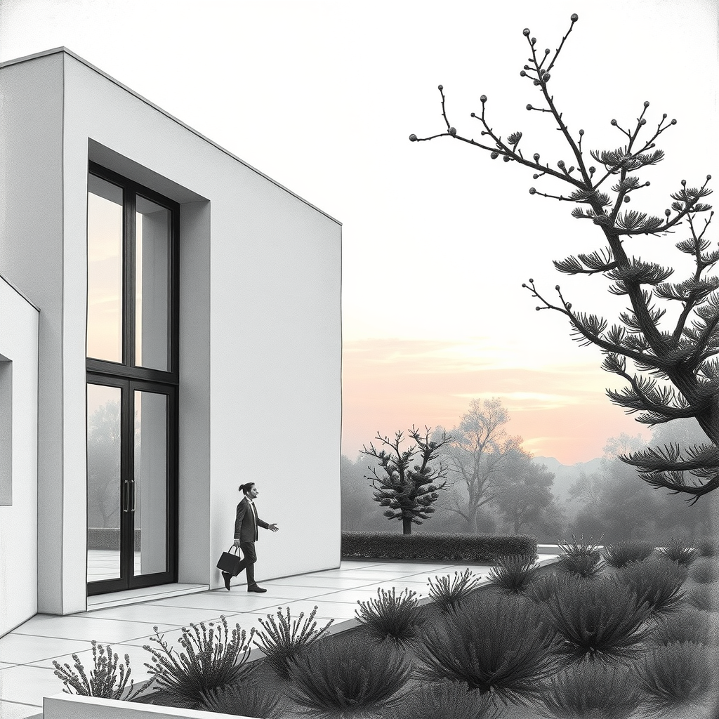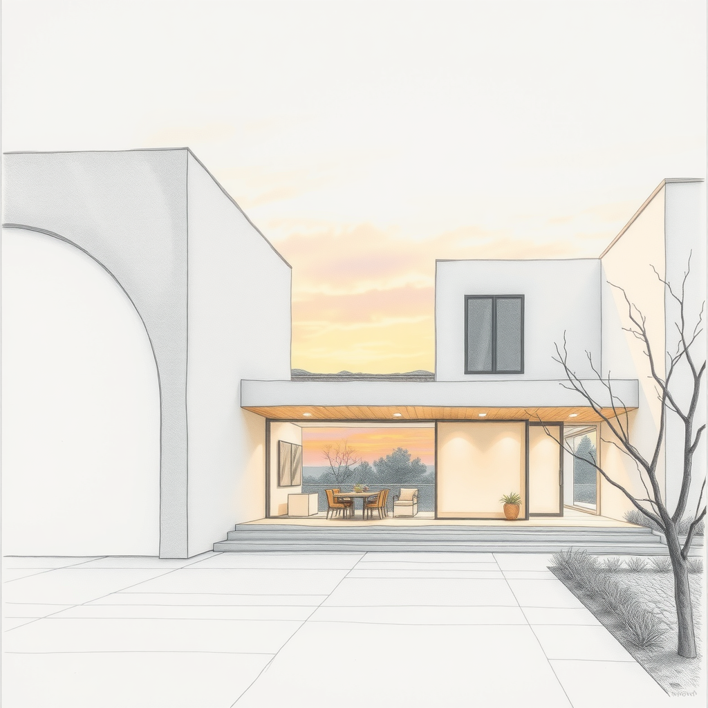 a minimalist modern architectural exterior at sunset, ultra-detailed, hyperreal textures, soft bokeh, natural skin tones. soft pastel accents. High resolution, cinematic, subtle film grain. β highly detailed graphite drawing, fine shading, soft texture, realistic pencil sketch style